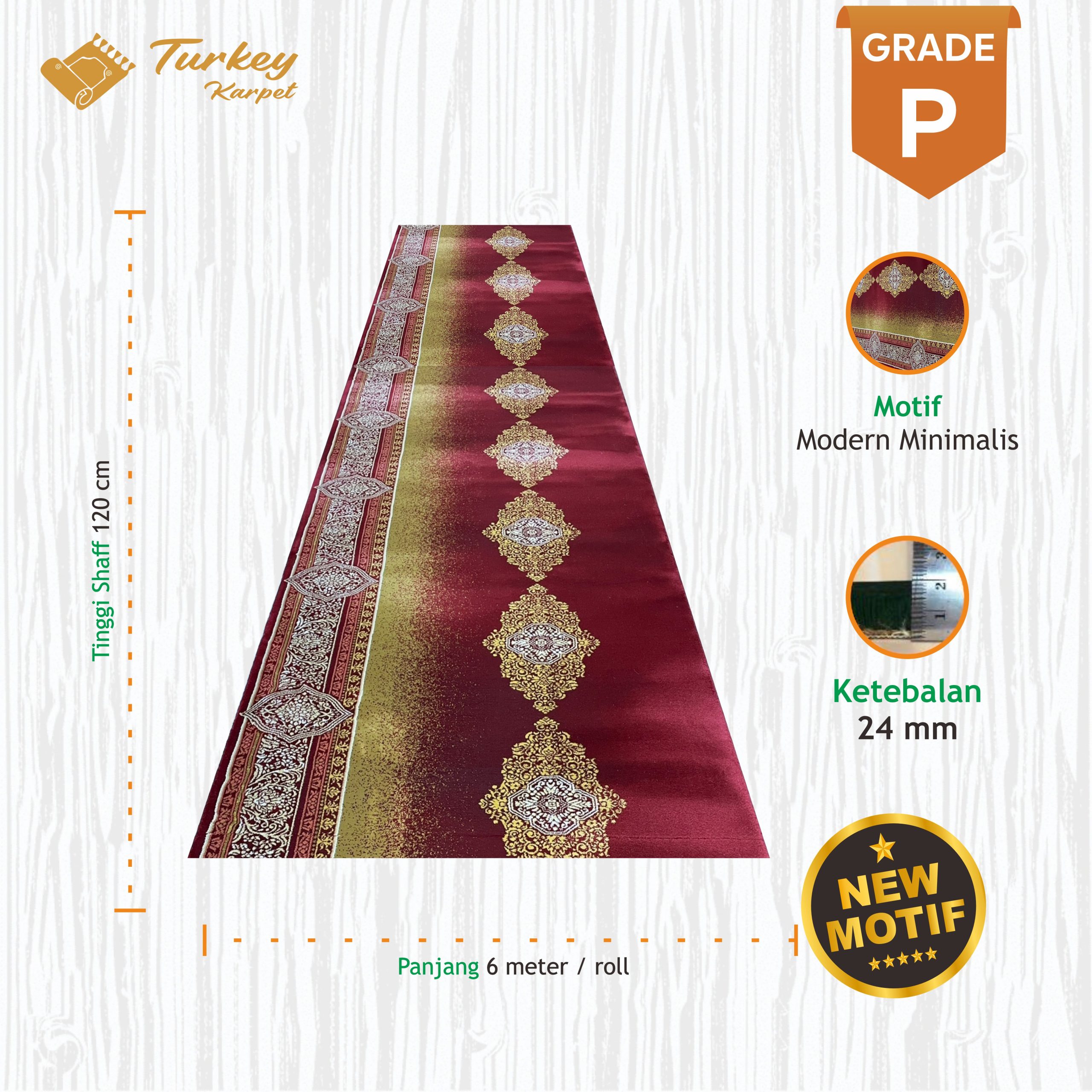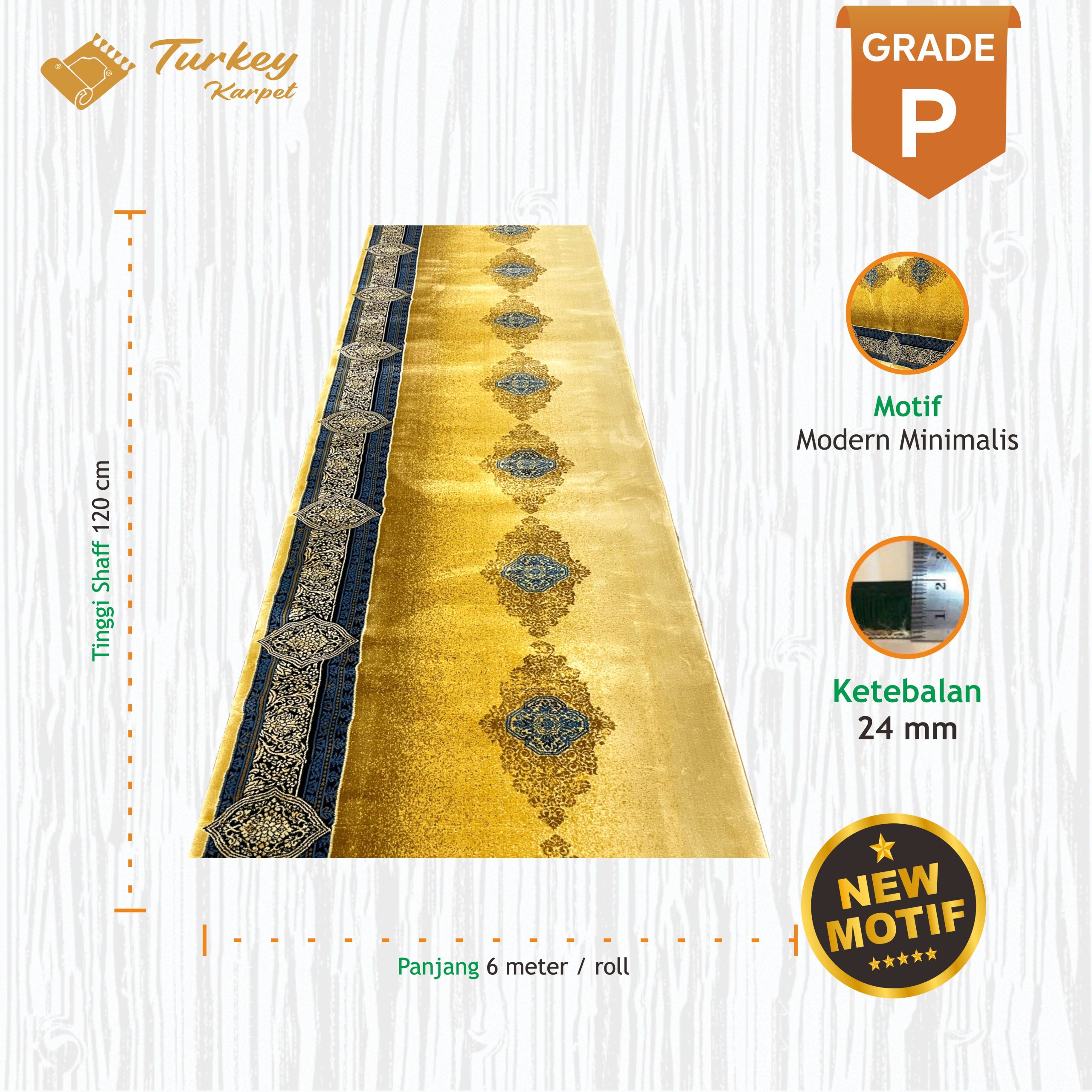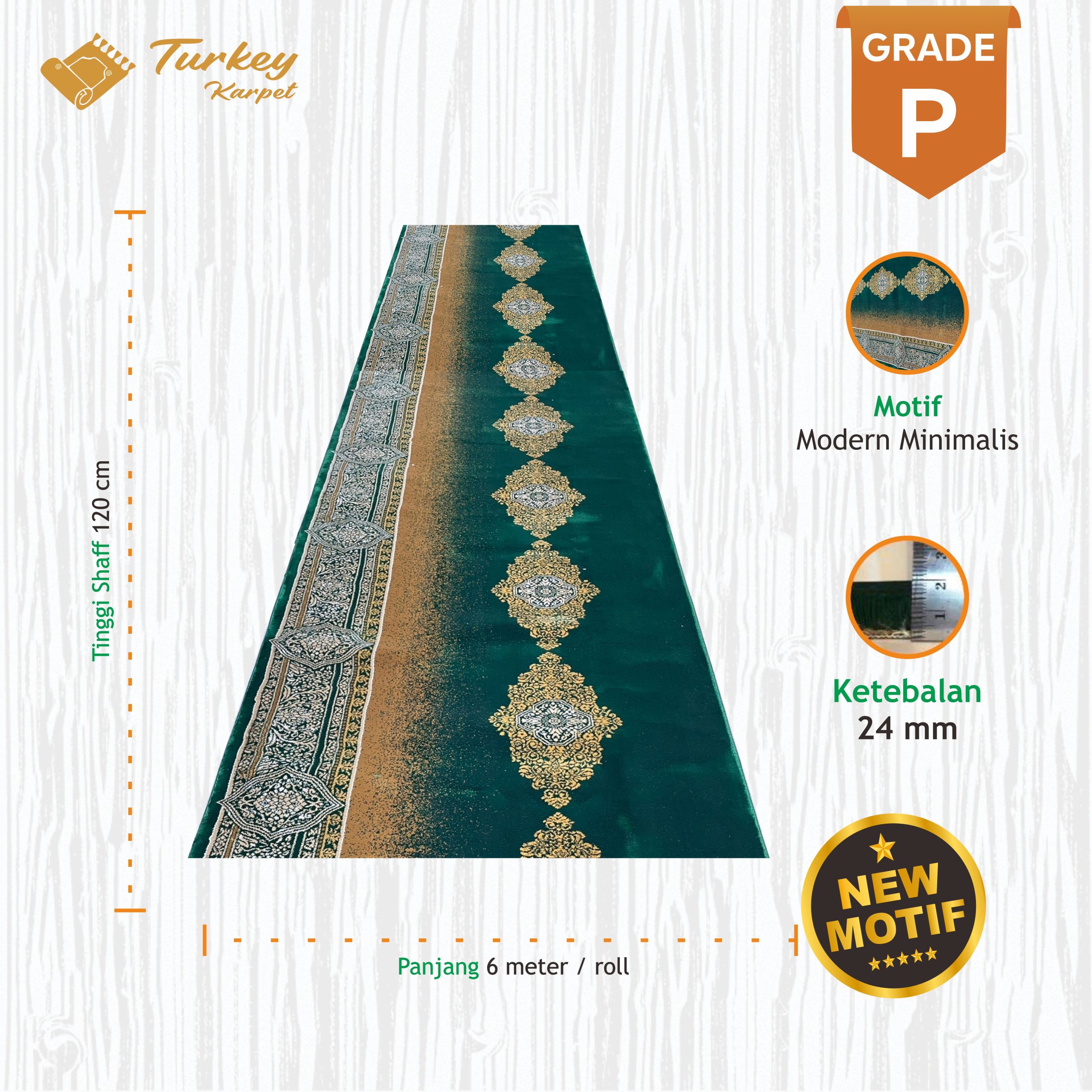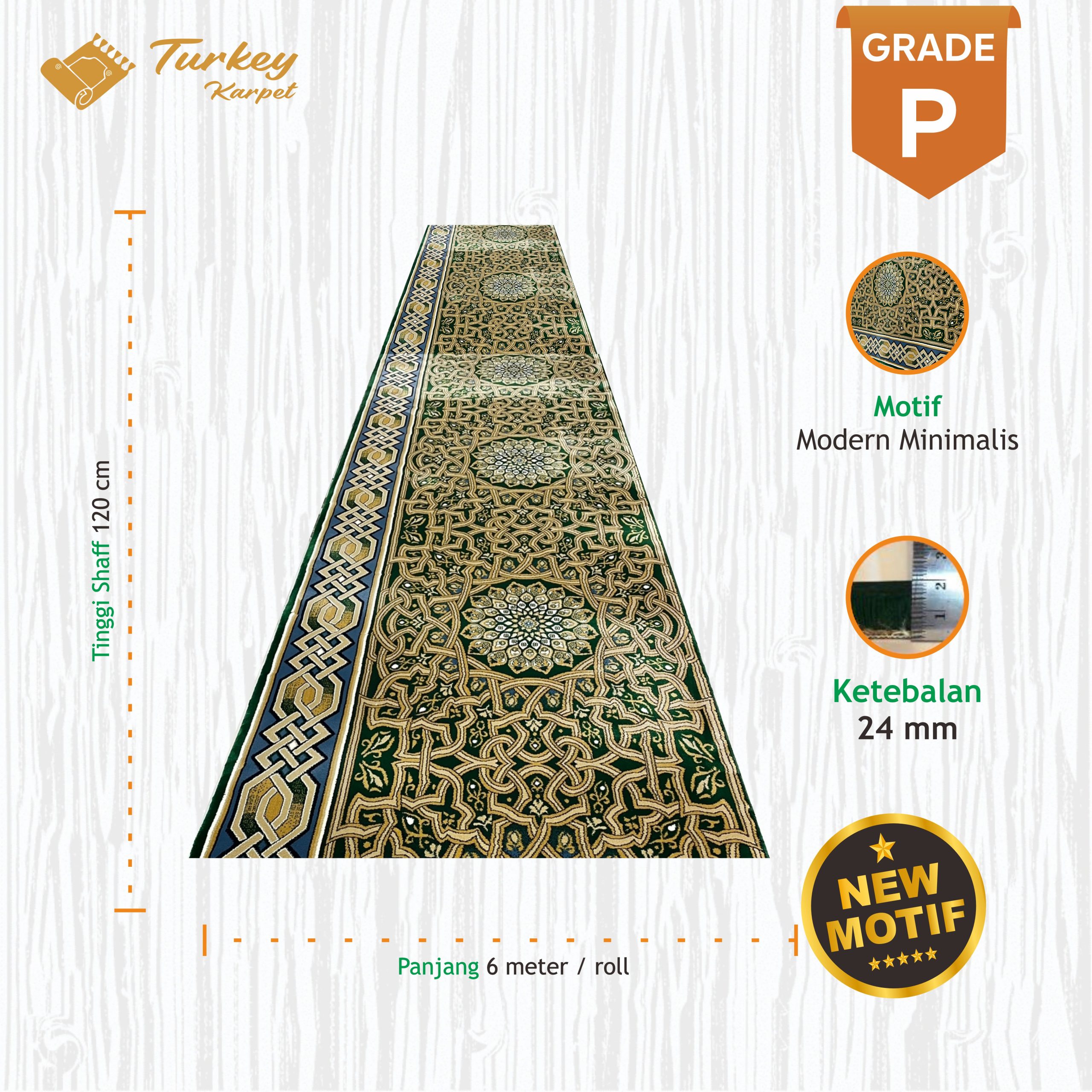 Karpet Masjid Turki Grade Premium adalah karpet masjid dengan kualitas terbaik yang memiliki ketebalan 18mm dan spesifikasi paling unggul yang menduduki posisi teratas dalam pilihan grade karpet masjid kami.